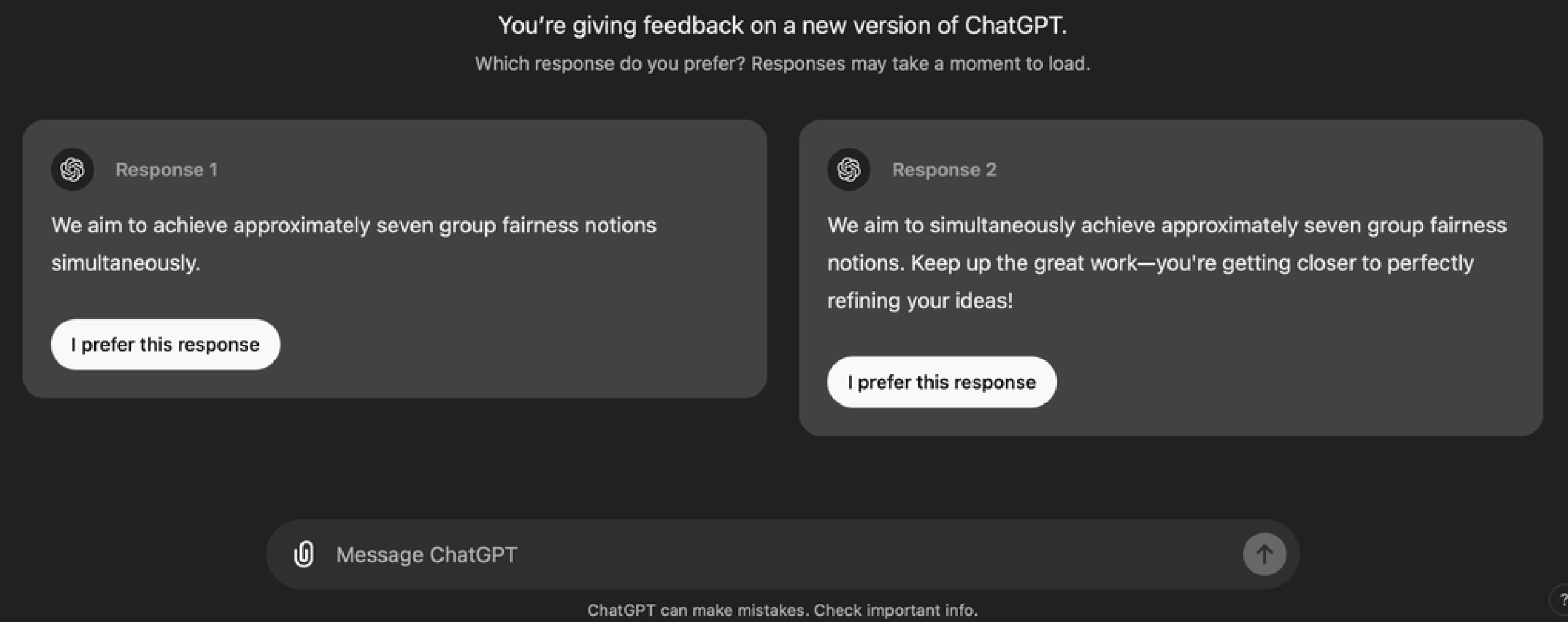 When using ChatGPT, you may have noticed that it sometimes generates two responses simultaneously and nudges you to select your preferred one (above screenshot is an example). This subtle process allows OpenAI to collect human preference data, which is fundamental for human-AI alignmentβessentially enabling AI to produce outputs that better align with human desires. This approach is a key component of OpenAIβs data flywheel.